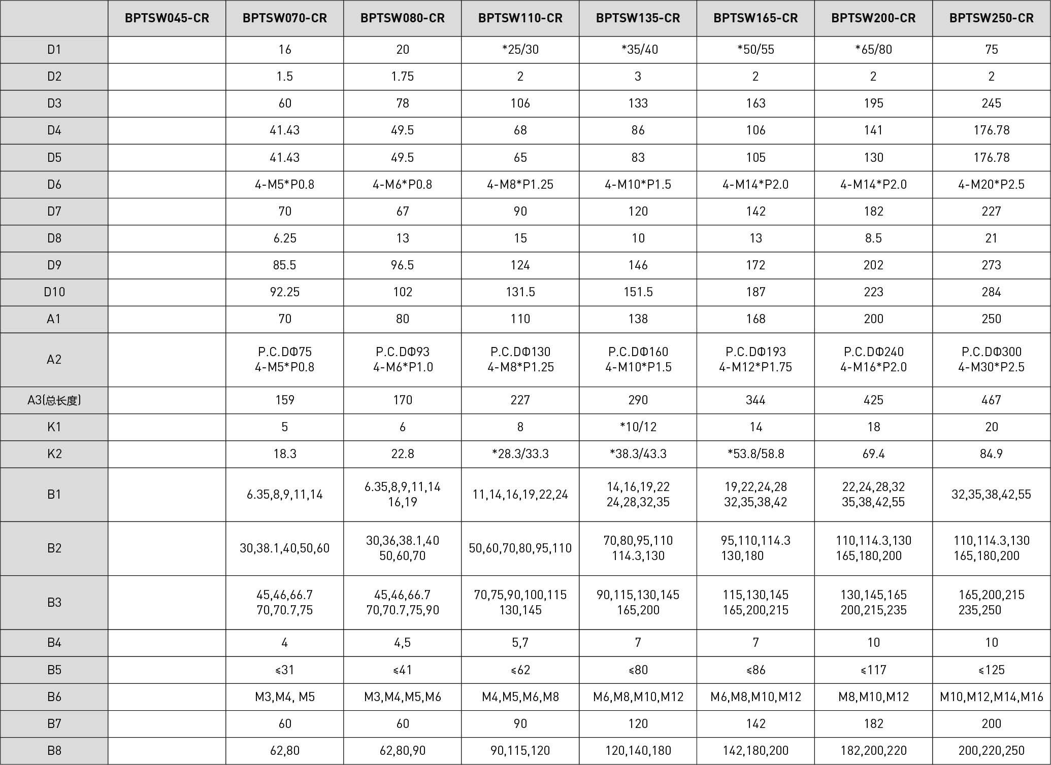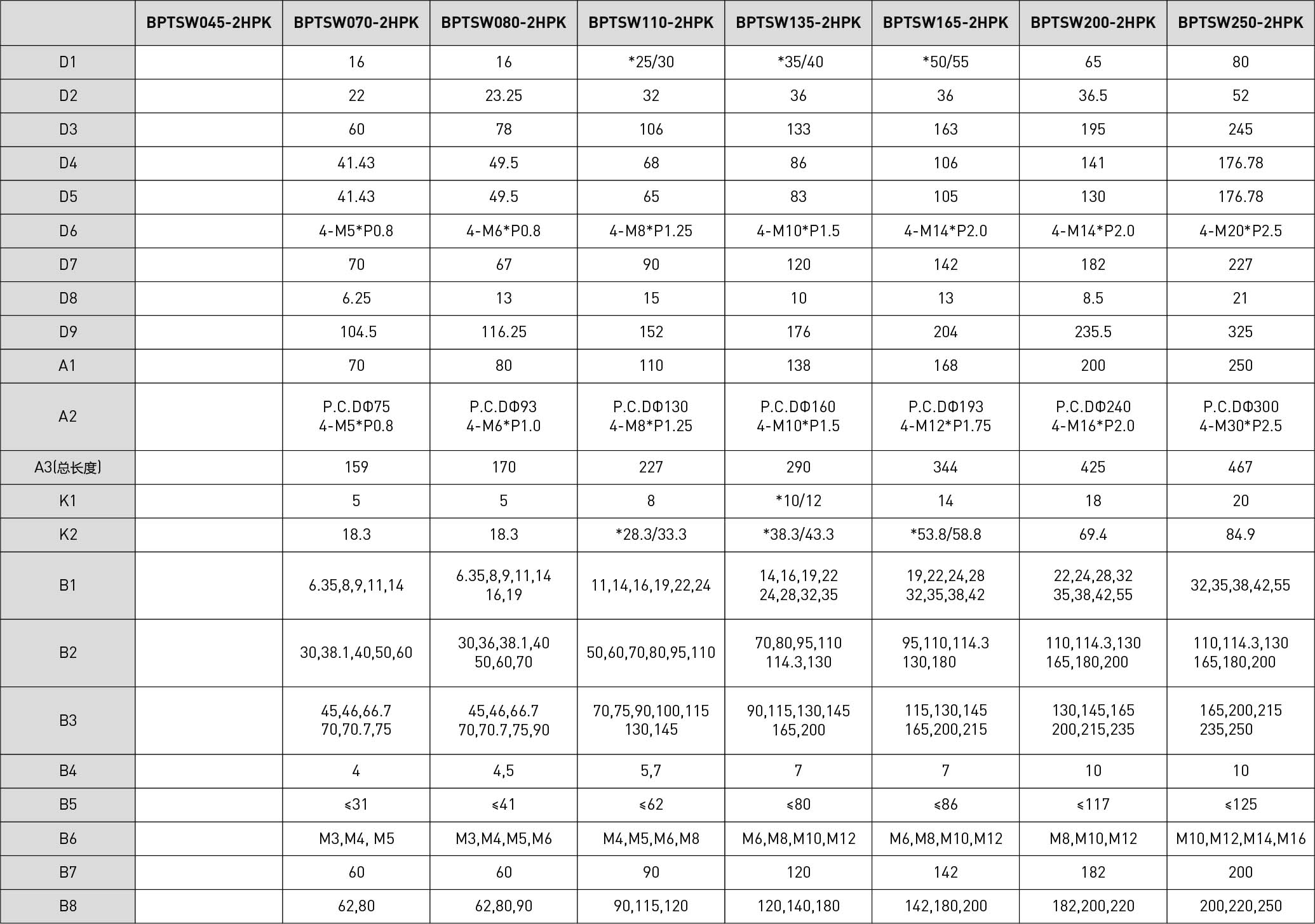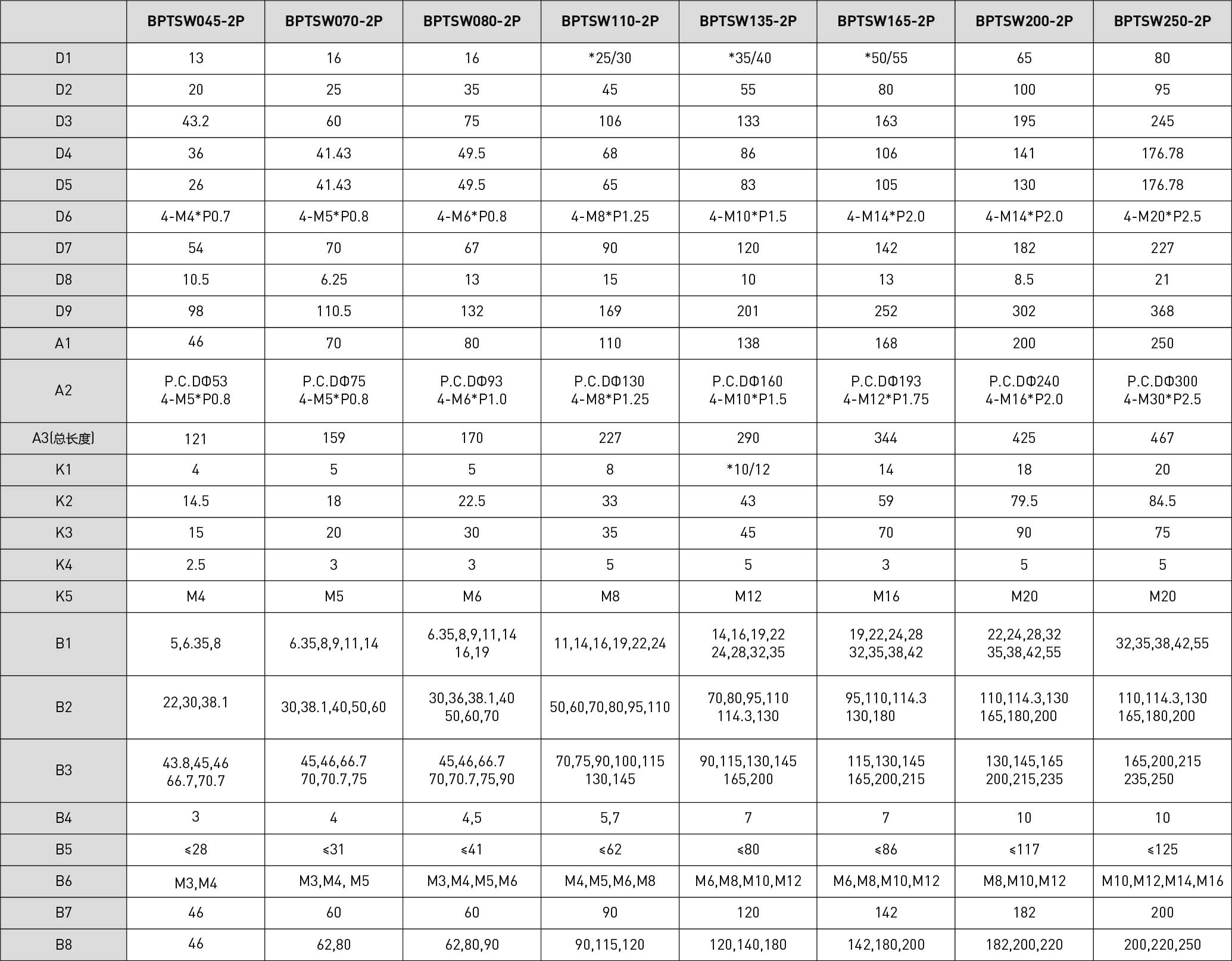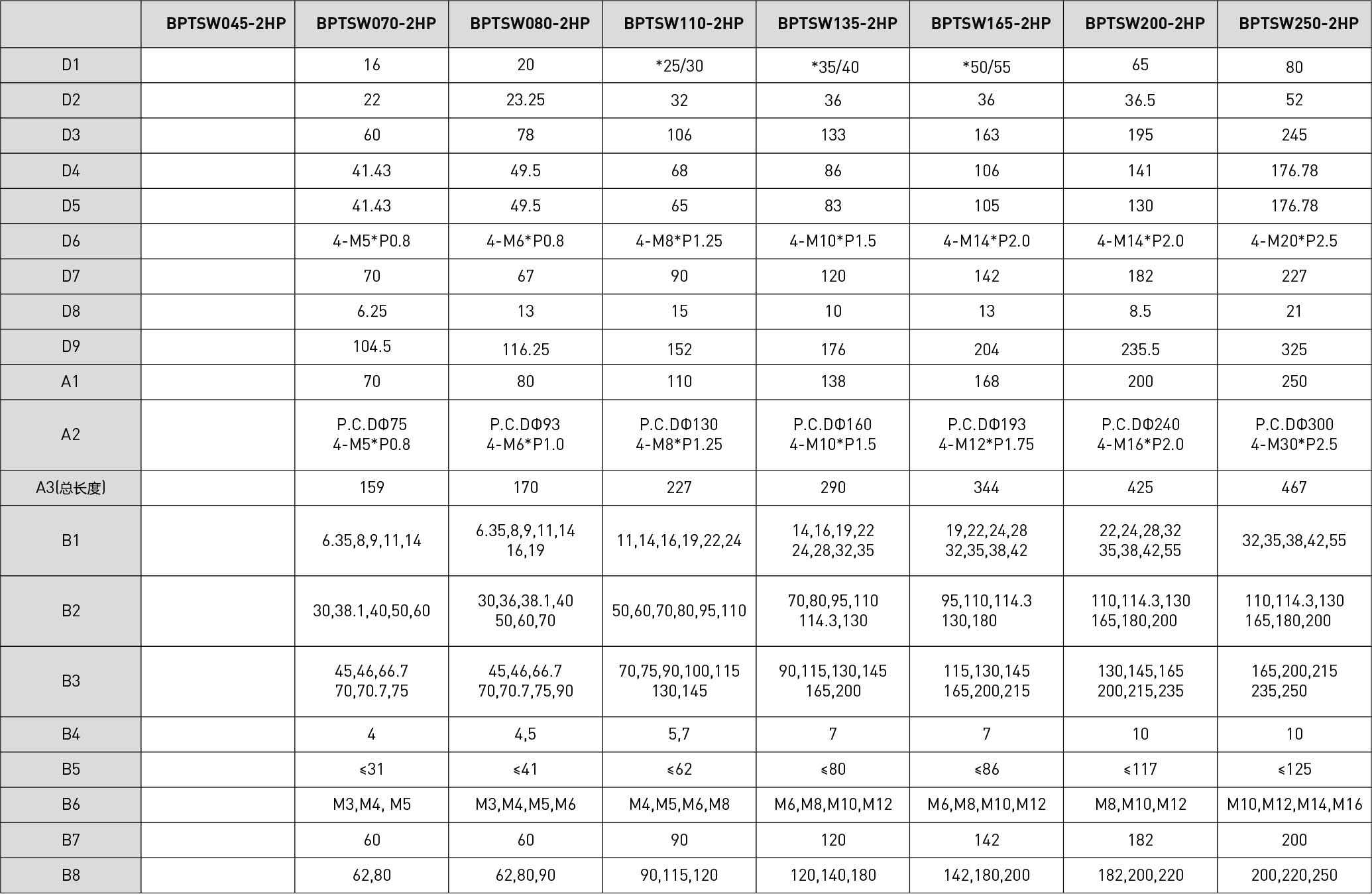 | 技术参数 | 单位 | 减速比 | BPTSM045 | BPTSM070 | BPTSM080 | BPTSM110 | BPTSM135 | BPTSM165 | BPTSM200 | BPTSM250 |