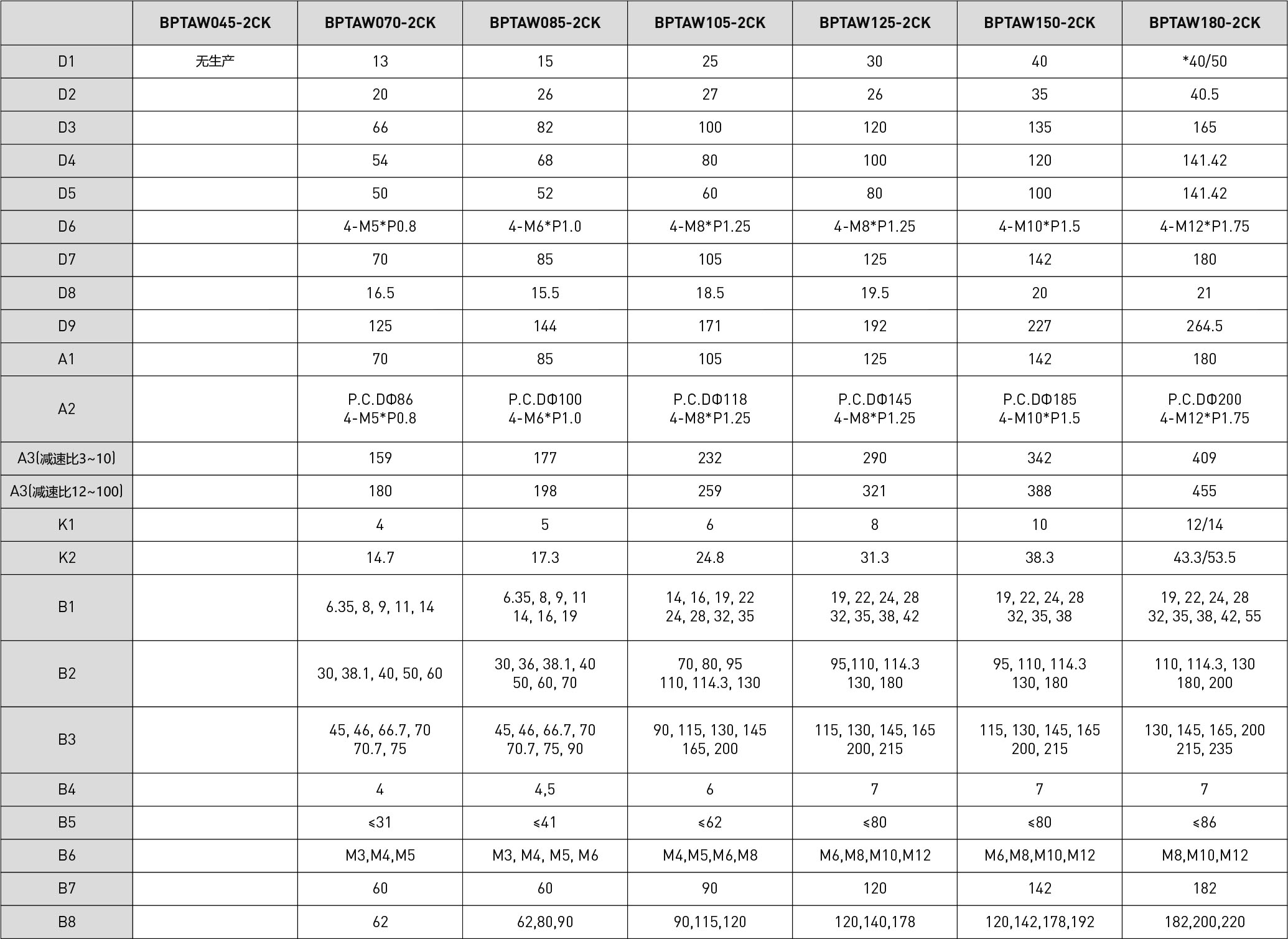 技术参数段数减速比BPTAW045BPTAW070BPTAW085BPTAW105BPTAW125BPTAW150BPTAW180