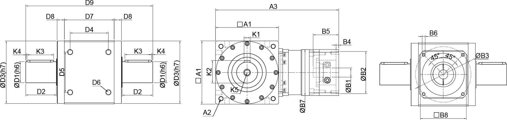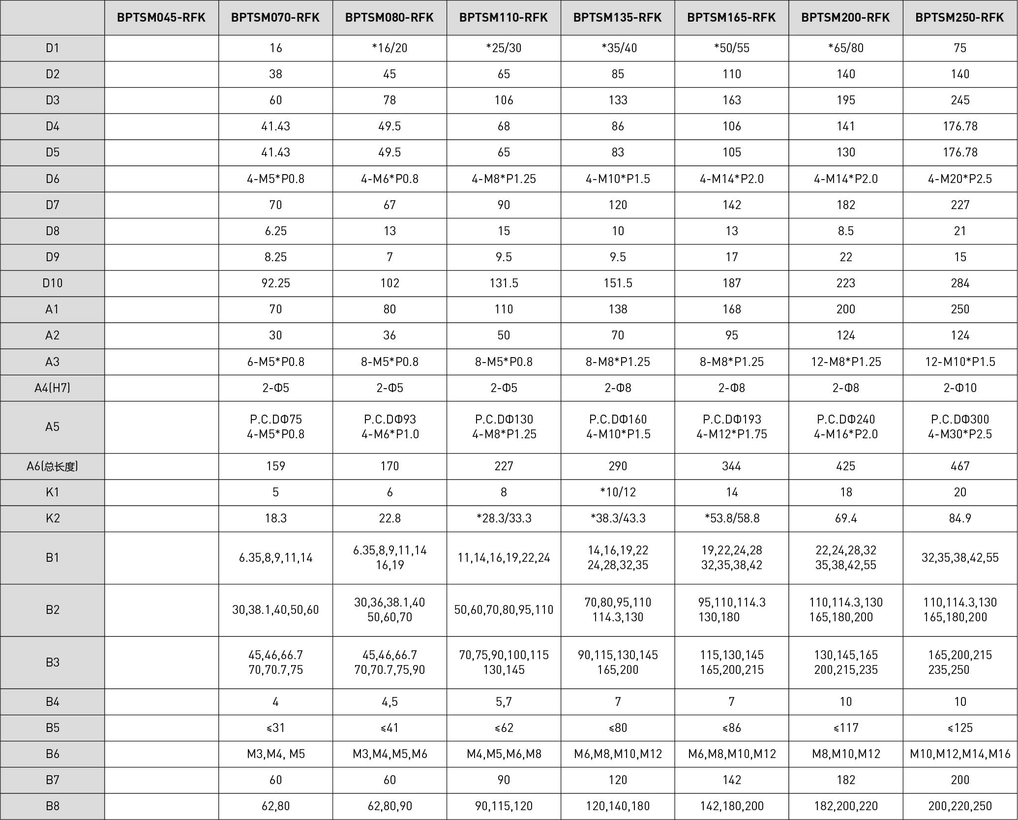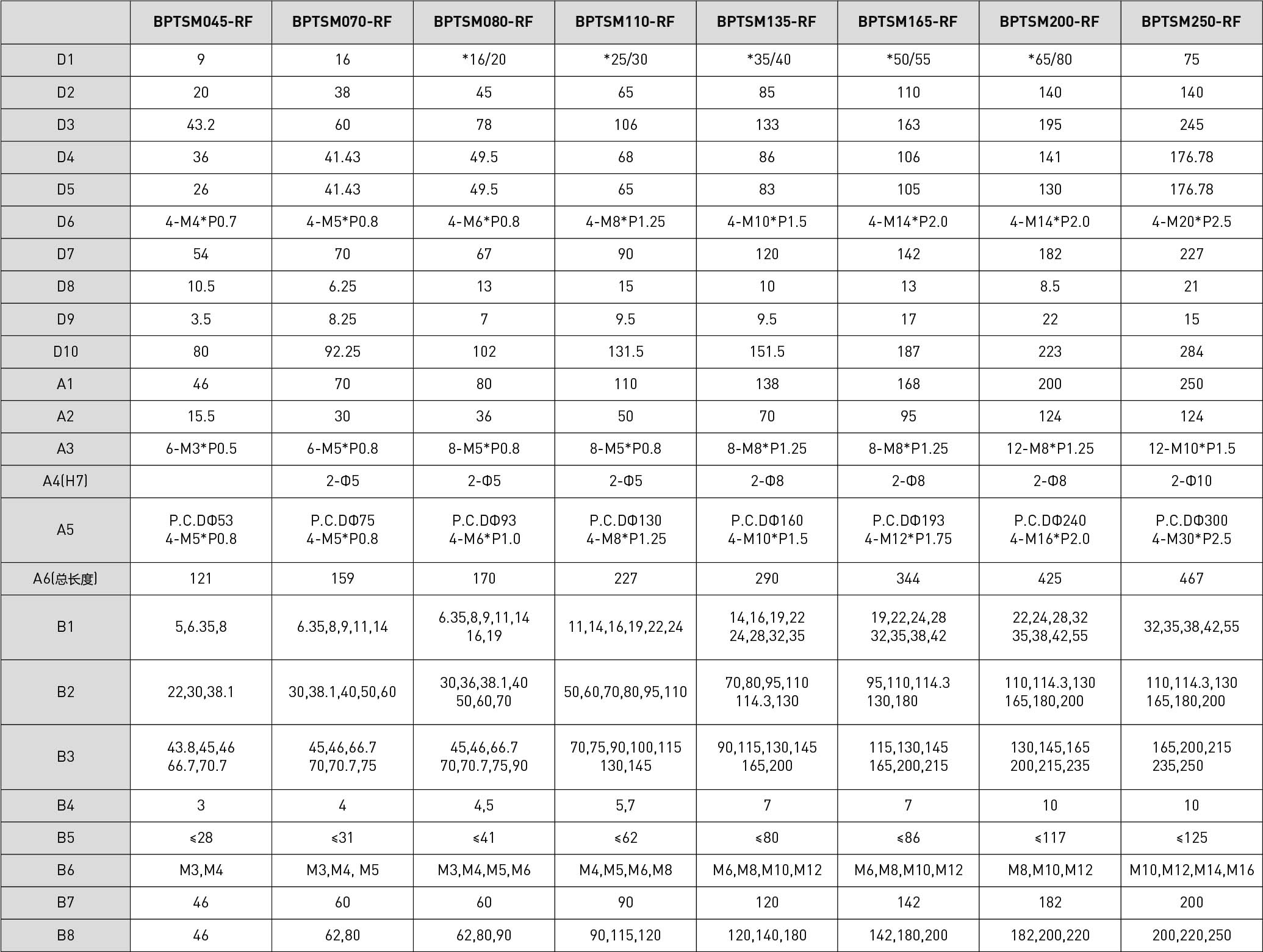 | 技术参数 | 单位 | 减速比 | BPTSM045 | BPTSM070 | BPTSM080 | BPTSM110 | BPTSM135 | BPTSM165 | BPTSM200 | BPTSM250 |