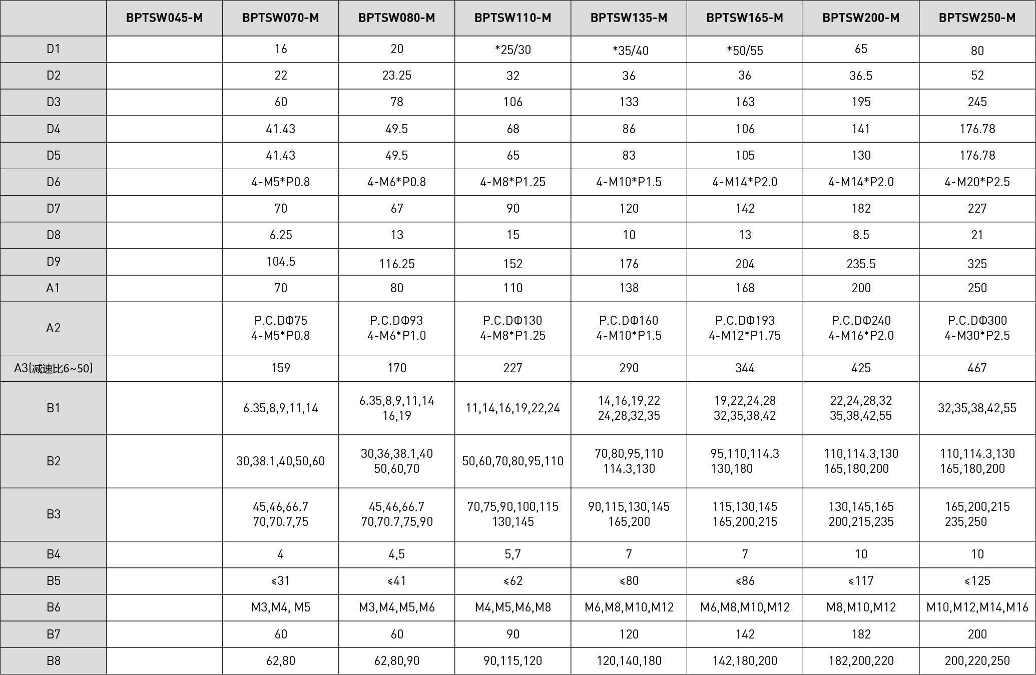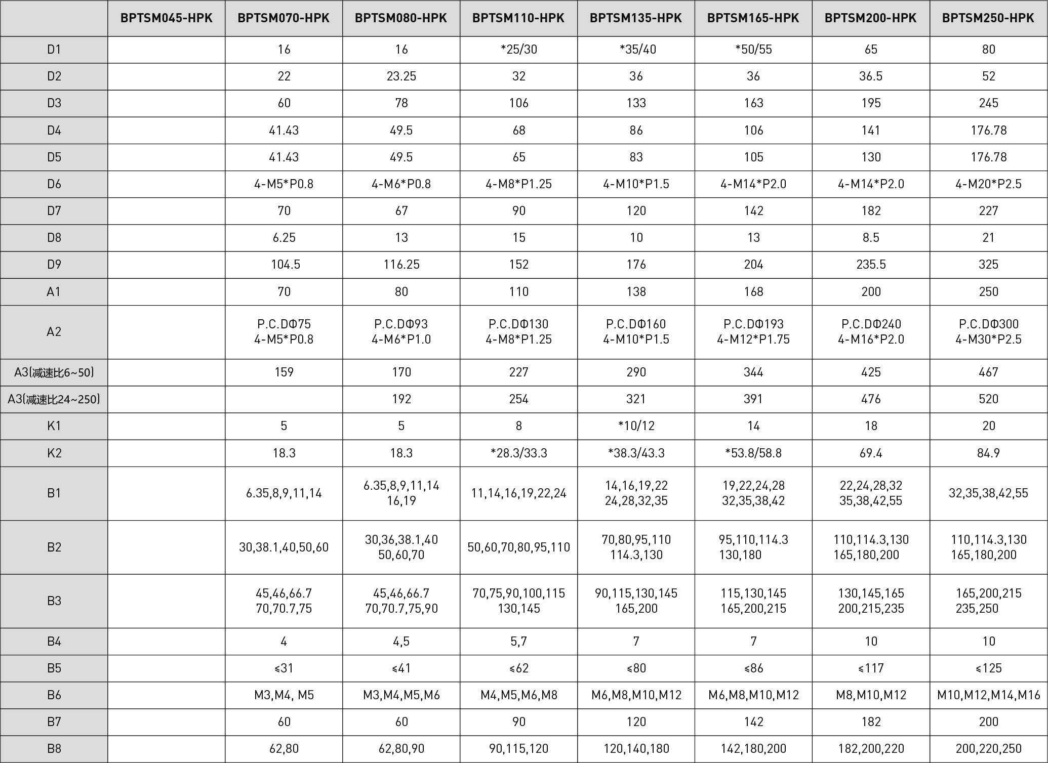 | 技术参数 | 减速比 | BPTSM045 | BPTSM070 | BPTSM080 | BPTSM110 | BPTSM135 | BPTSM165 | BPTSM200 | BPTSM250 |