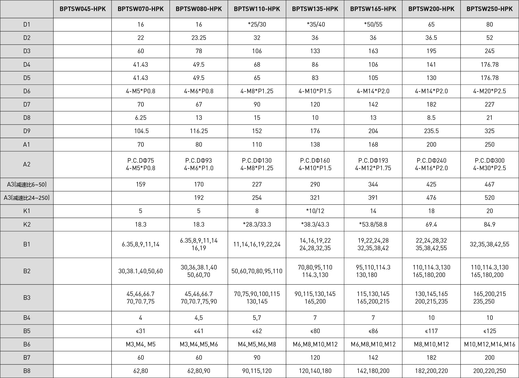 技术参数段数减速比BPTSW045BPTSW070BPTSW080BPTSW110BPTSW135BPTSW165BPTSW200BPTSW250